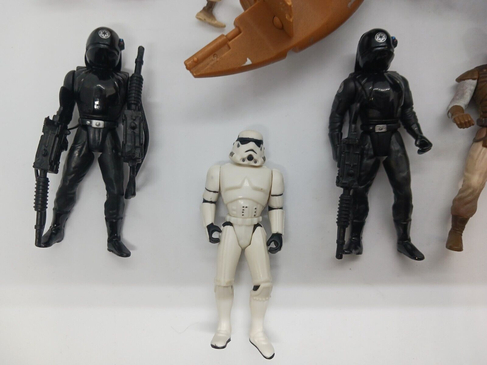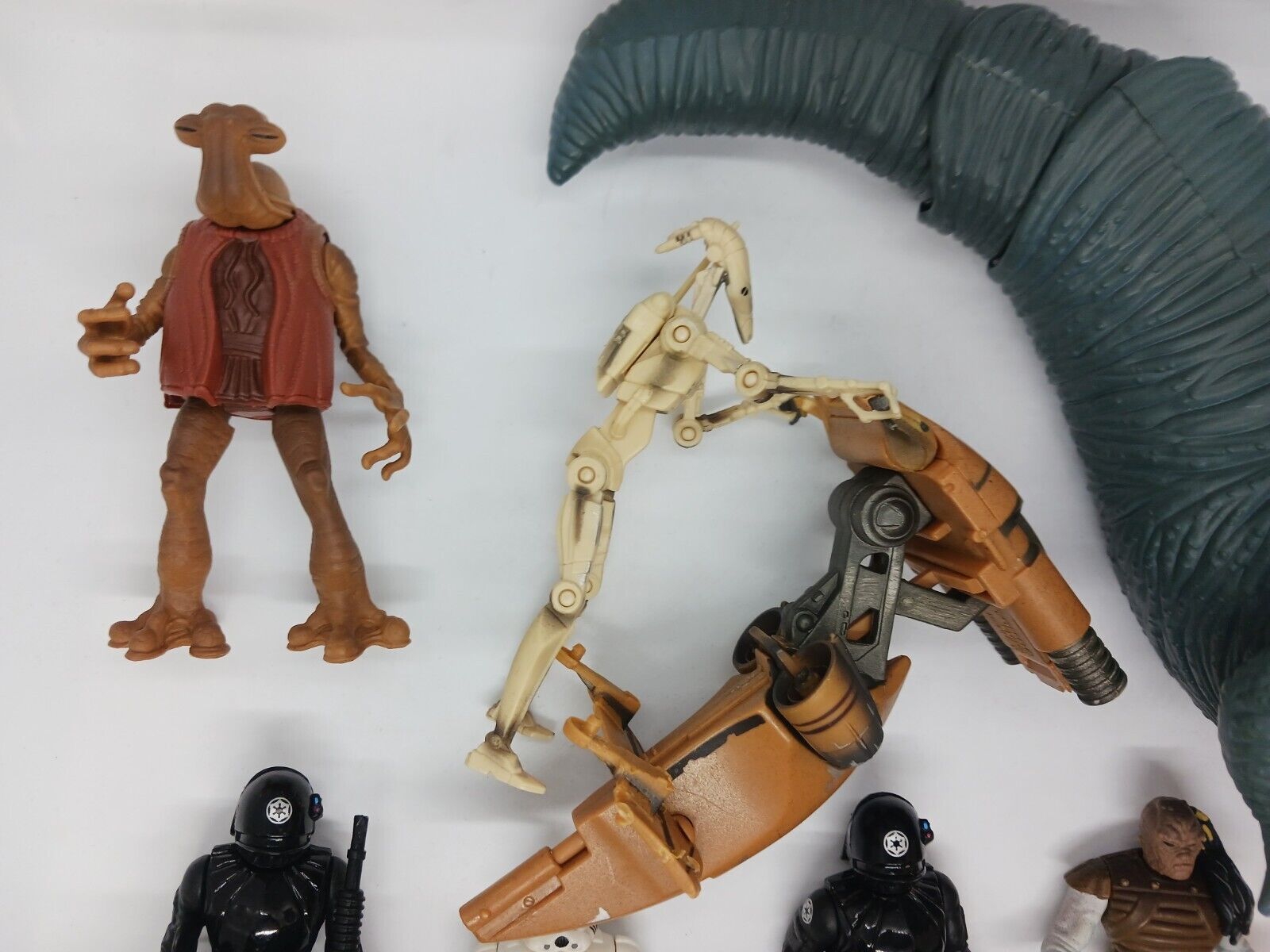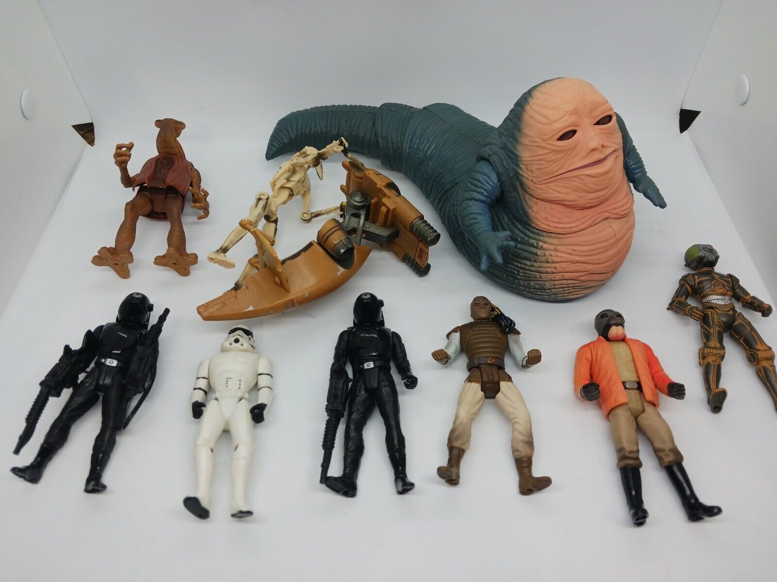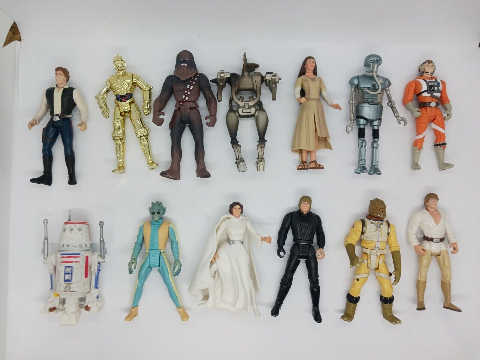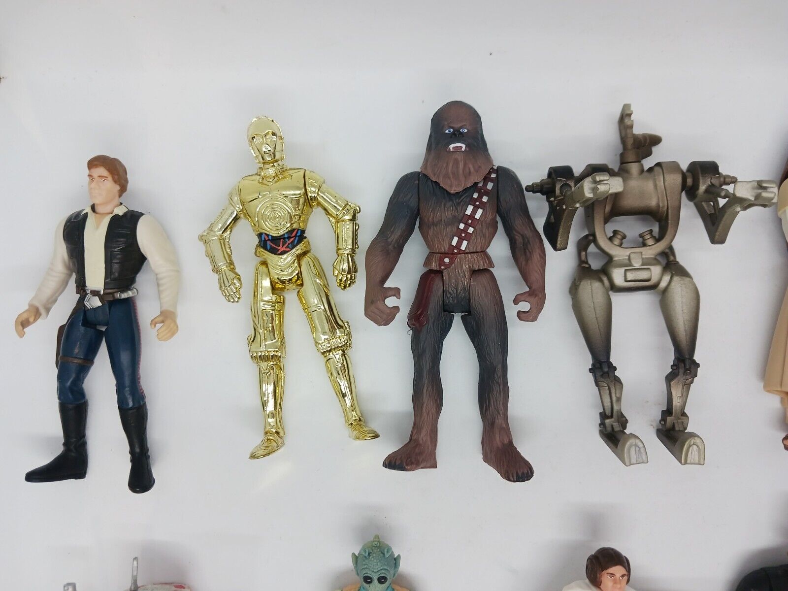 All action figures come loose (NOT in their original packaging). Lot includes famous characters such as, but not limited to: Luke Skywalker, Han Solo, Chewbacca, Princess Leia, C-3PO, Jabba The Hutt, Greedo, & Trade Federation Battle Droid on Speeder.