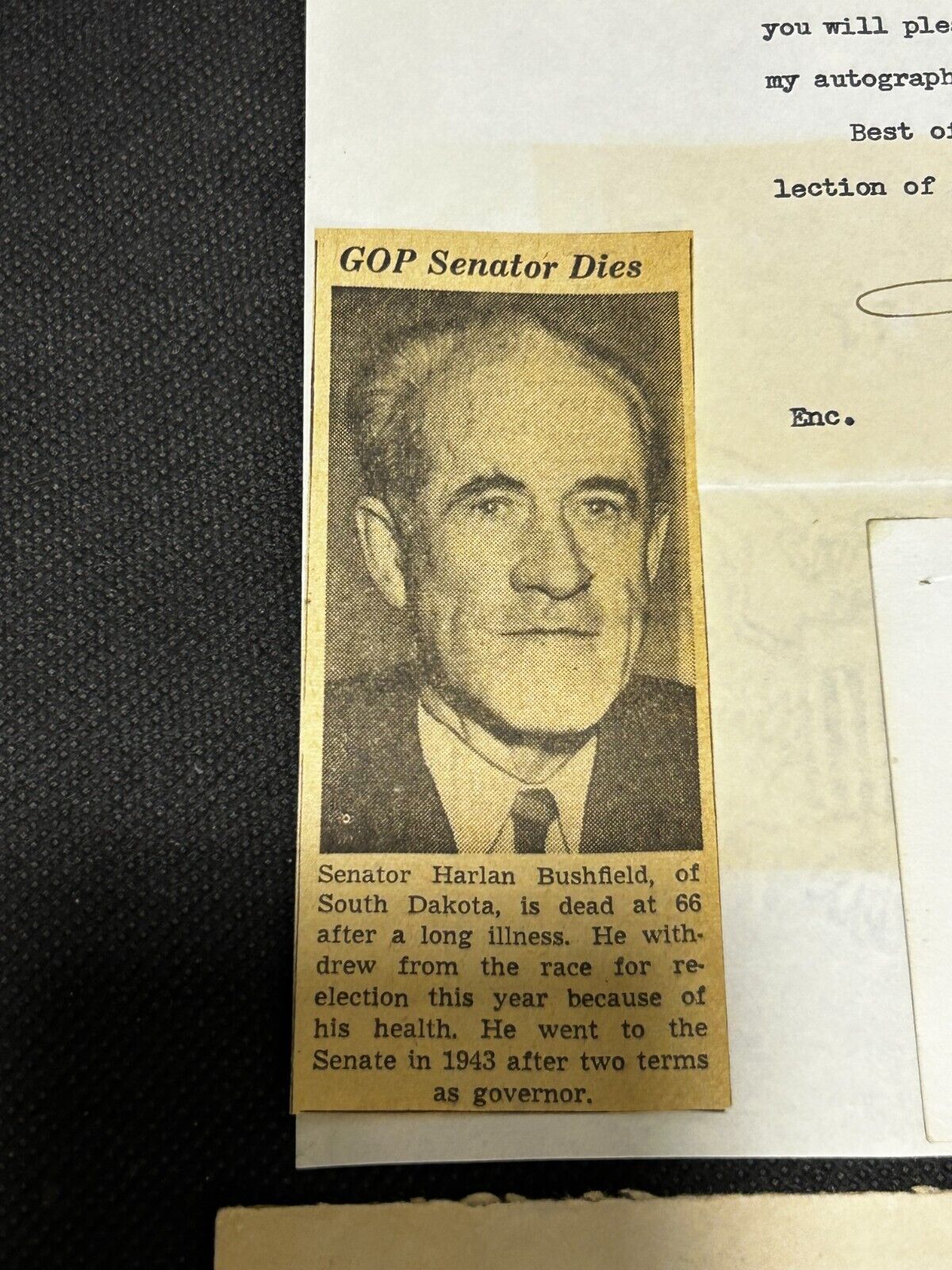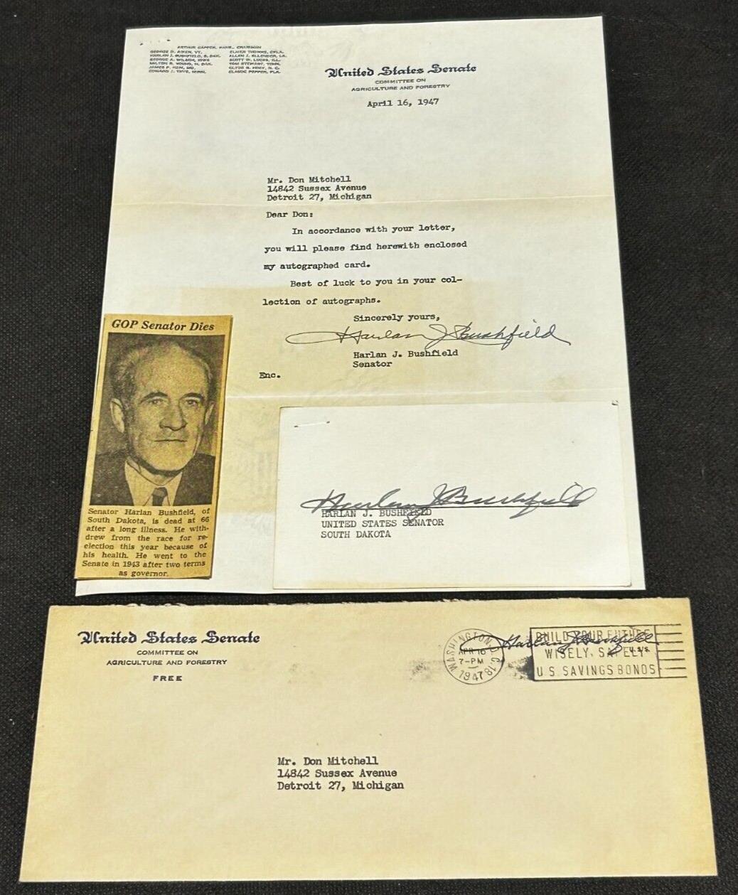 Thank you for viewing our listing for: April 16th 1947 Autograph of Harlan J. Bushfield Senator of South Dakota, EX