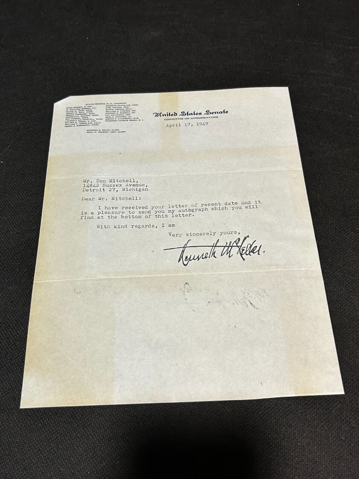 Thank you for viewing our listing for: April 17th 1947 Autograph of Kenneth McKellar Senator of Tennessee, EX
