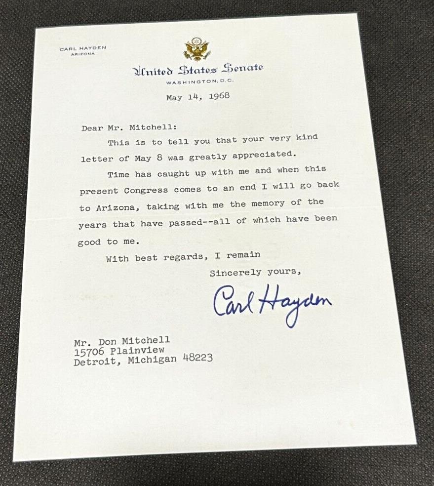 Thank you for viewing our listing for: May 14th 1968 Signed Autograph Letter of Carl Hayden Senator of Arizona, EX