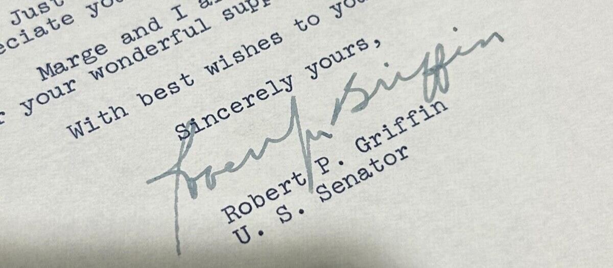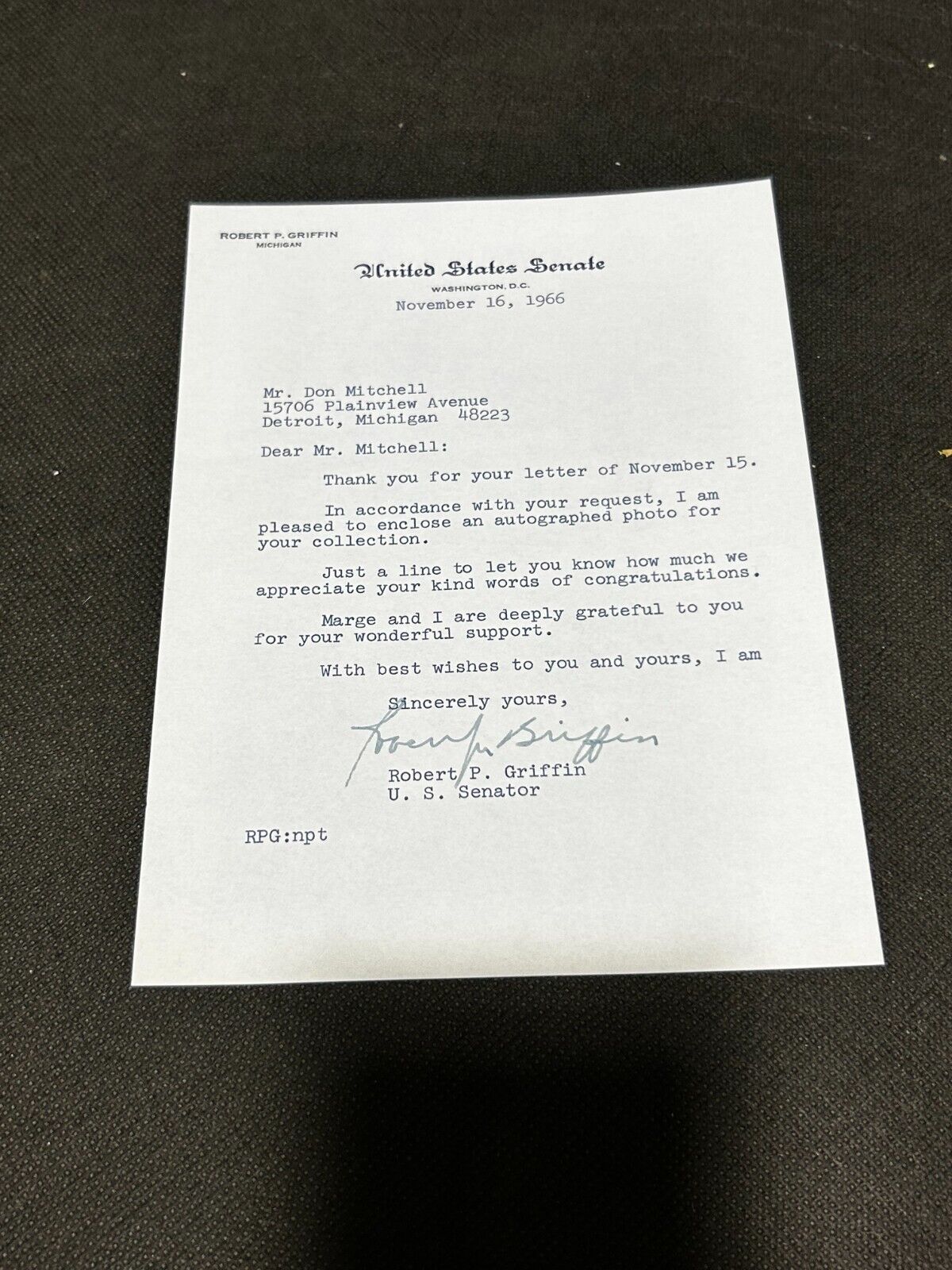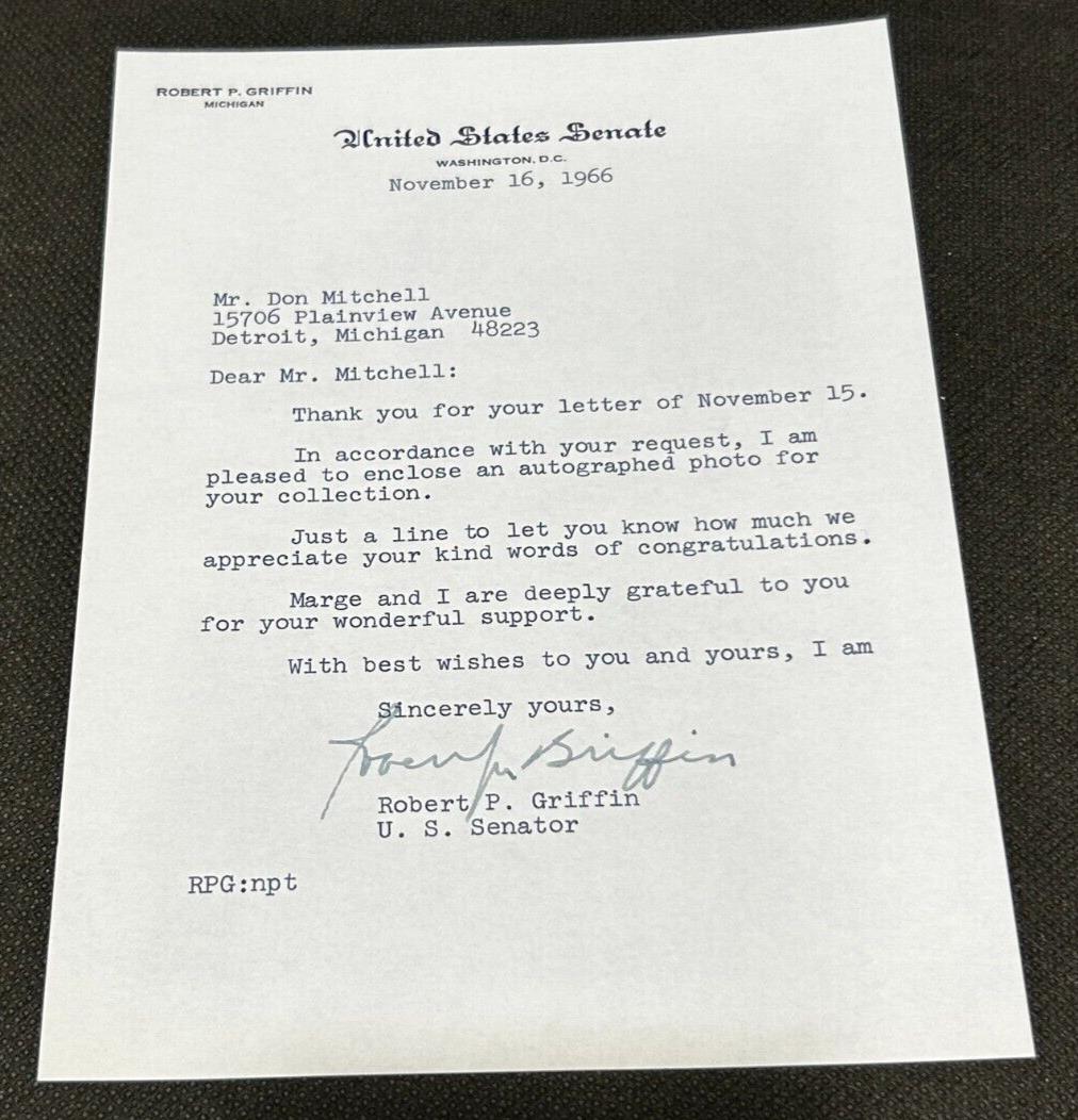 Thank you for viewing our listing for: November 16th 1966 Autograph Letter of Robert Griffin Senator of Michigan, EX