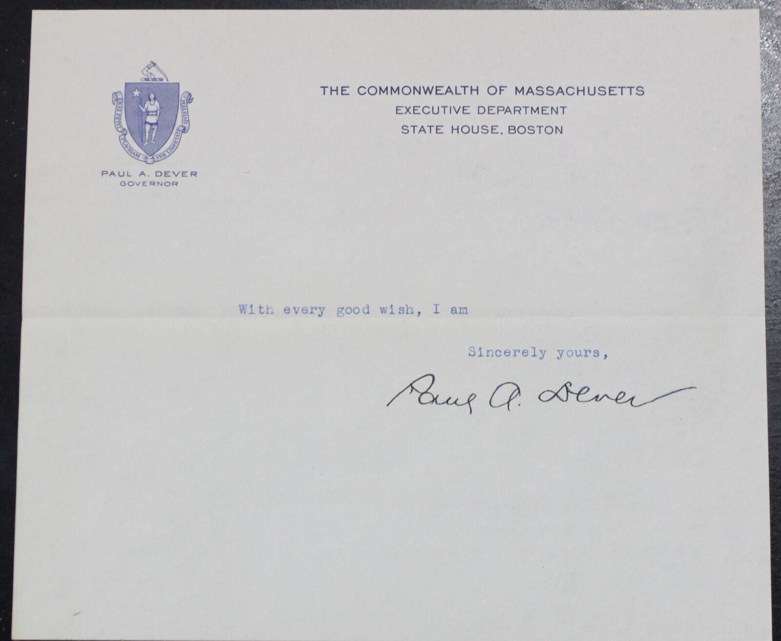 Paul A. Dever Autograph (Governor of Massachusetts, 1949-1953)