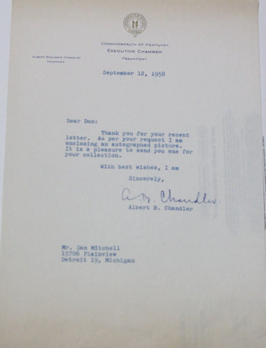 Albert "Happy" Chandler Autographs (Governor of Kentucky, 1935-1939 & 1955-1959)
