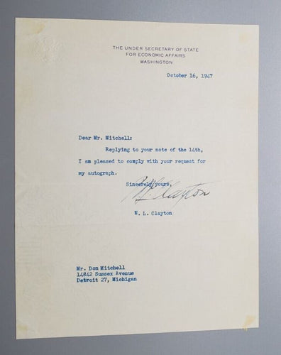 1947 Autograph Under Secretary of State W. L. Clayton Signed