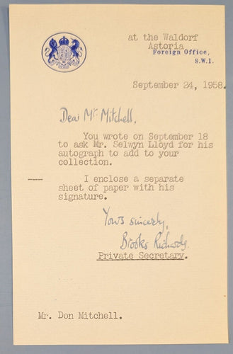 1958 UK Foreign Office Letter Brooks Richards re: Selwyn Lloyd Autograph