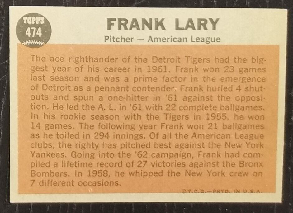 Thank you for viewing our listing for: 1962 Topps Frank Lary #474 Baseball Card EX