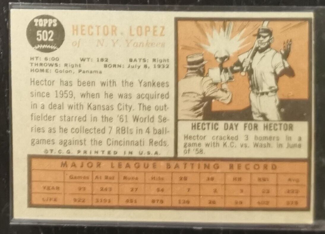 Thank you for viewing our listing for: 1962 Topps Hector Lopez #502 Baseball Card VG-EX