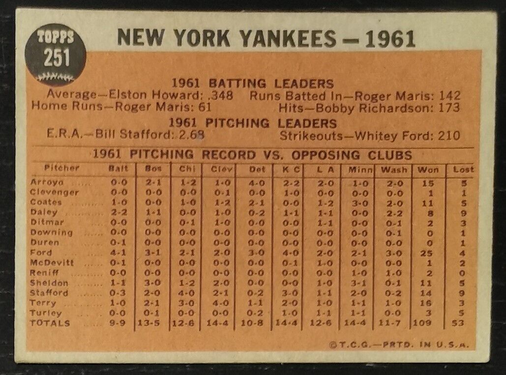 Thank you for viewing our listing for: 1962 Topps New York Yankees - 1961 #251 Baseball Card VG-EX