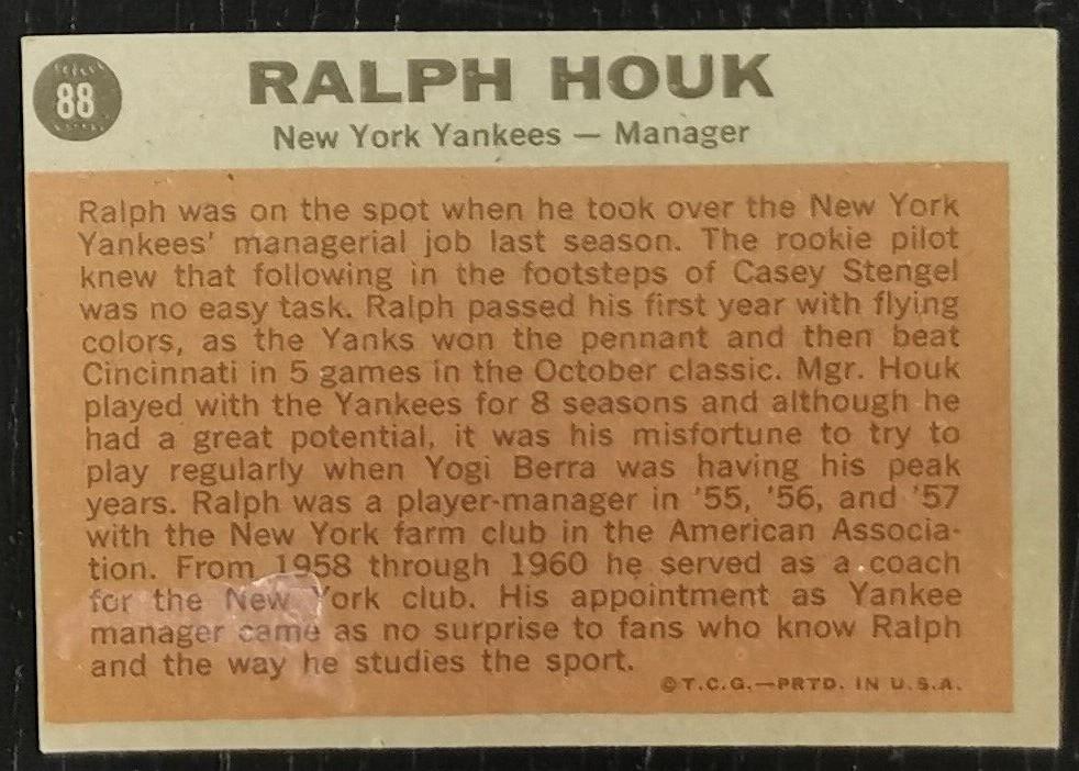 Thank you for viewing our listing for: 1962 Topps Ralph Houk #88 Baseball Card VG