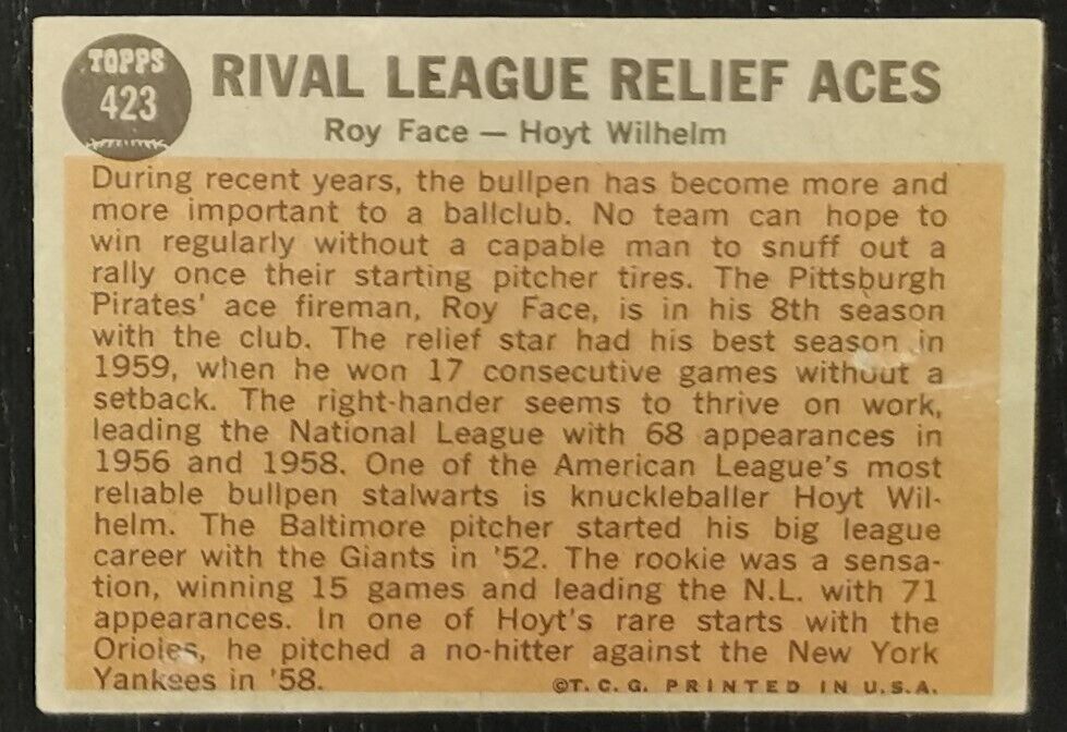 Thank you for viewing our listing for: 1962 Topps Rival League Relief Aces #423 Baseball Card VG-EX