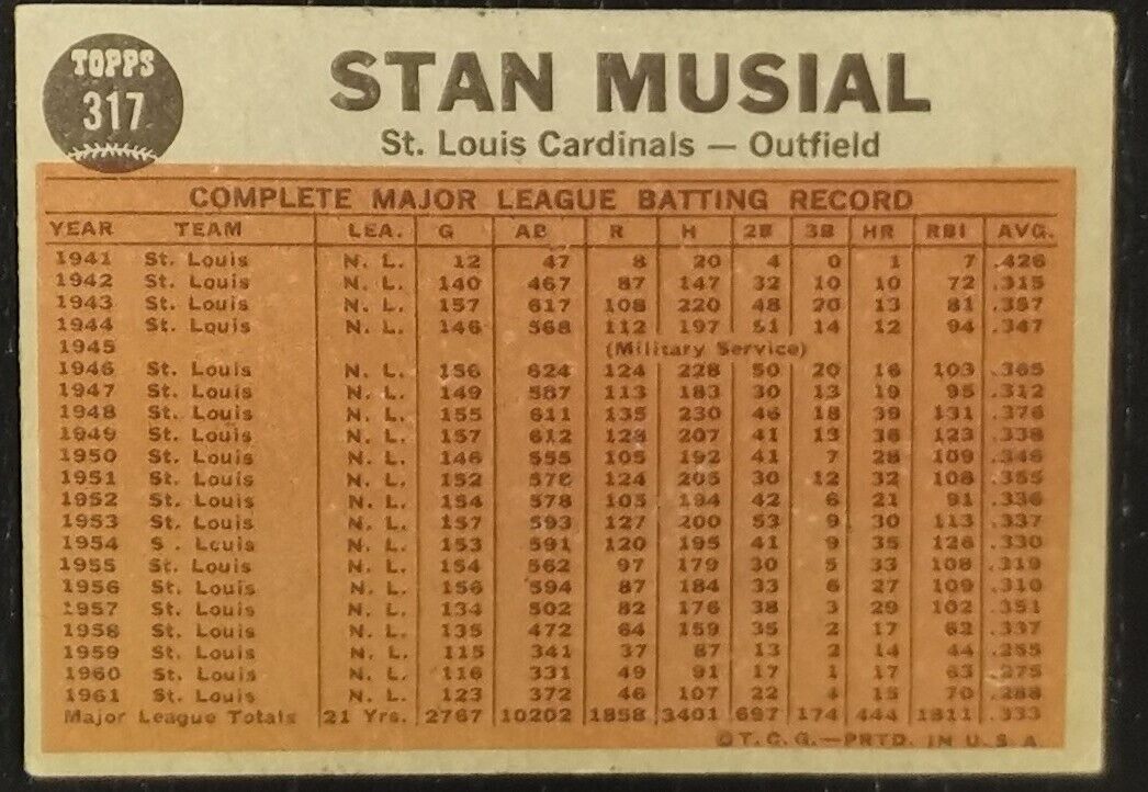Thank you for viewing our listing for: 1962 Topps Stan Musical - Musial Plays 21st Season #317 Baseball Card VG-EX
