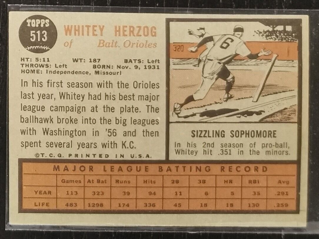 Thank you for viewing our listing for: 1962 Topps Whitey Herzog #513 Baseball Card VG-EX