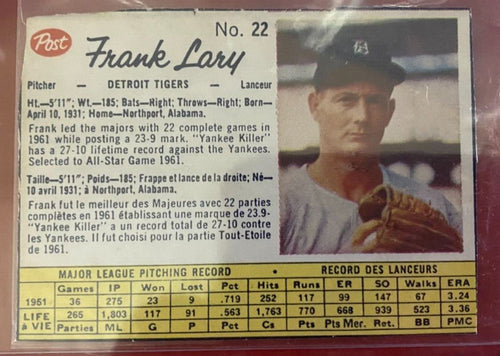 1962 Post Canadian Detroit Tigers Frank Lary Hand cut