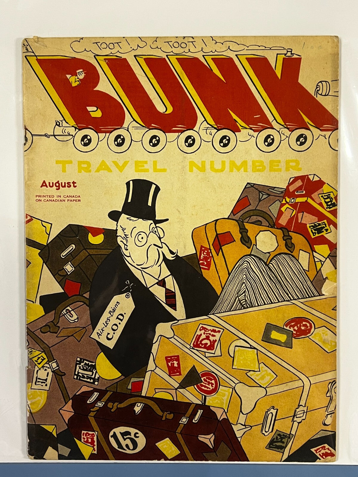 Vintage BUNK Magazine, August 1932, Travel Number, Vol. 2 No. 1. Features cover art by Clayton Rawson. Printed in Canada on Canadian paper. Original price 15 cents. A humor and cartoon magazine from the era.