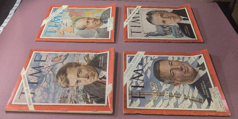 Condition: Previously enjoyed. Good. Visible wear due to age, including slightly curled/bent edges and corners, some potential fading or discoloration. Back covers feature cigarette advertisements. One magazine (Evtushenko cover) notes (April 20, 1962 is actually Karl Barth, Yevtushenko was April 13, 1962, One magazine (Ferkauf cover) notes (July 27, 1962 is Samuel Newhouse Sr., Ferkauf was July 6, 1962). SOLD AS IS (please see pictures)