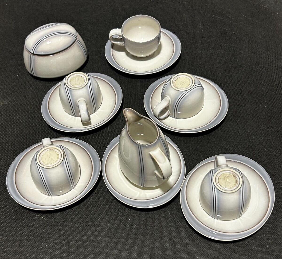 5 x Cups and Saucer, 1 x Creamer , 1 x Sugar pot with lid