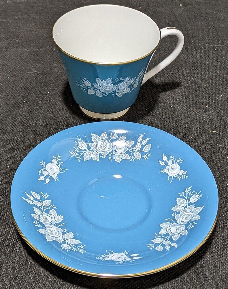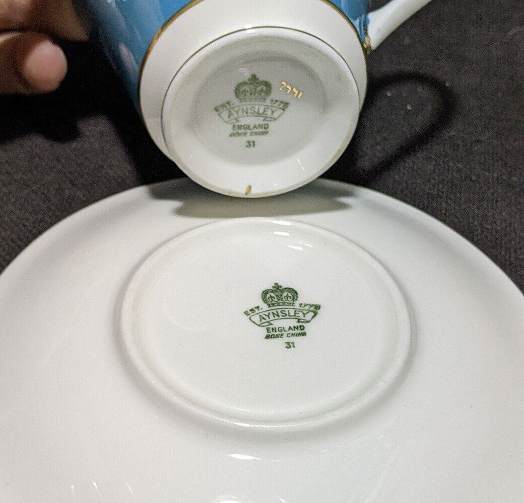 AYNSLEY Fine Bone China Tea Cup & Saucer - Teal Blue & White Flowers