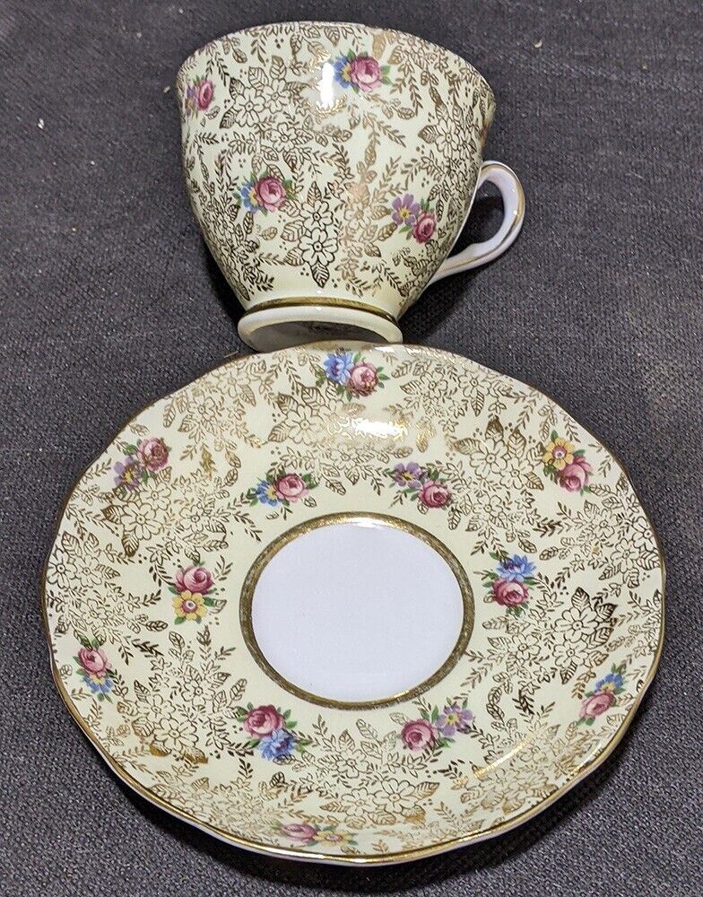 Thank you for viewing our listing for: Colclough Bone China Tea Cup & Saucer -- Heavy Gold Detail With Flowers