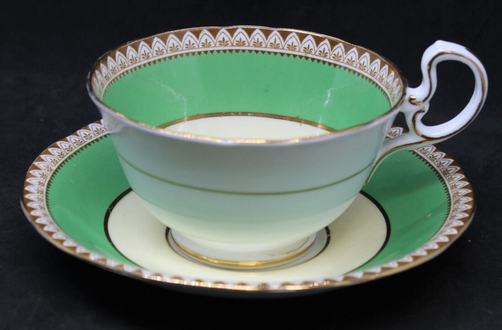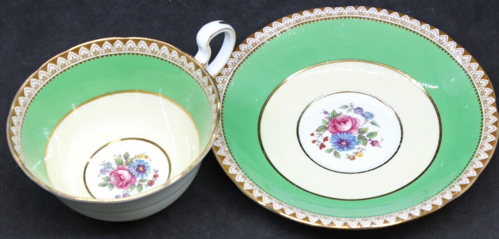 Green, Gold Trim Aynsley Bone China Cup and Saucer w/ Flower Bouquet Center