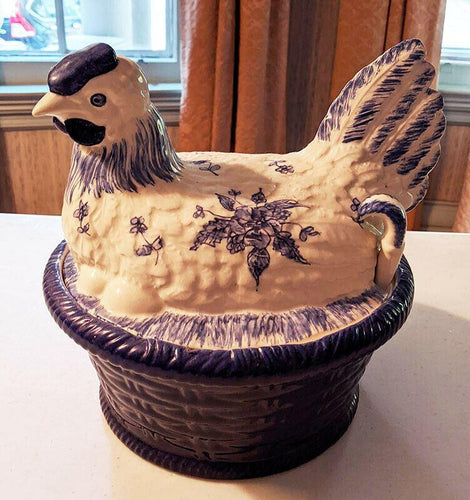 Vintage Blue & White Chicken Topped Ceramic Tureen With Ladle