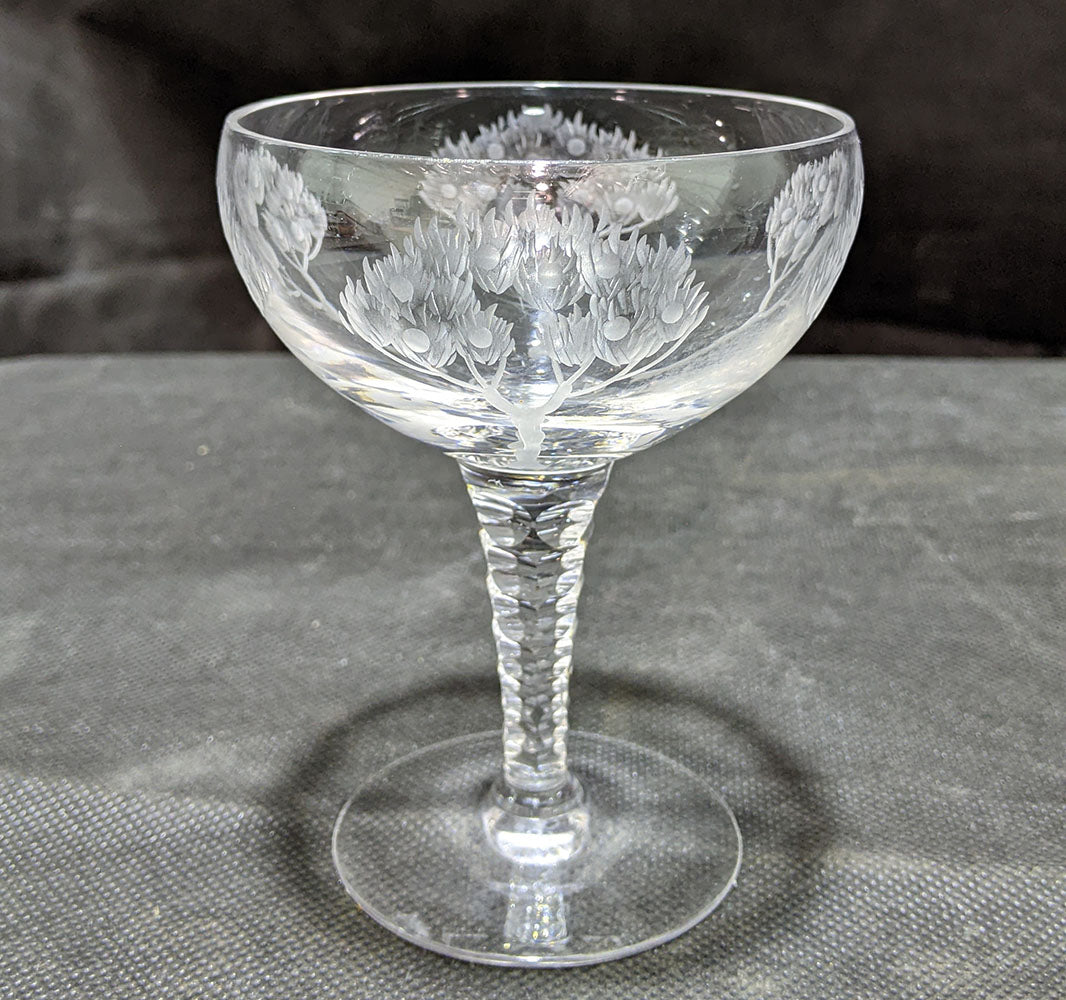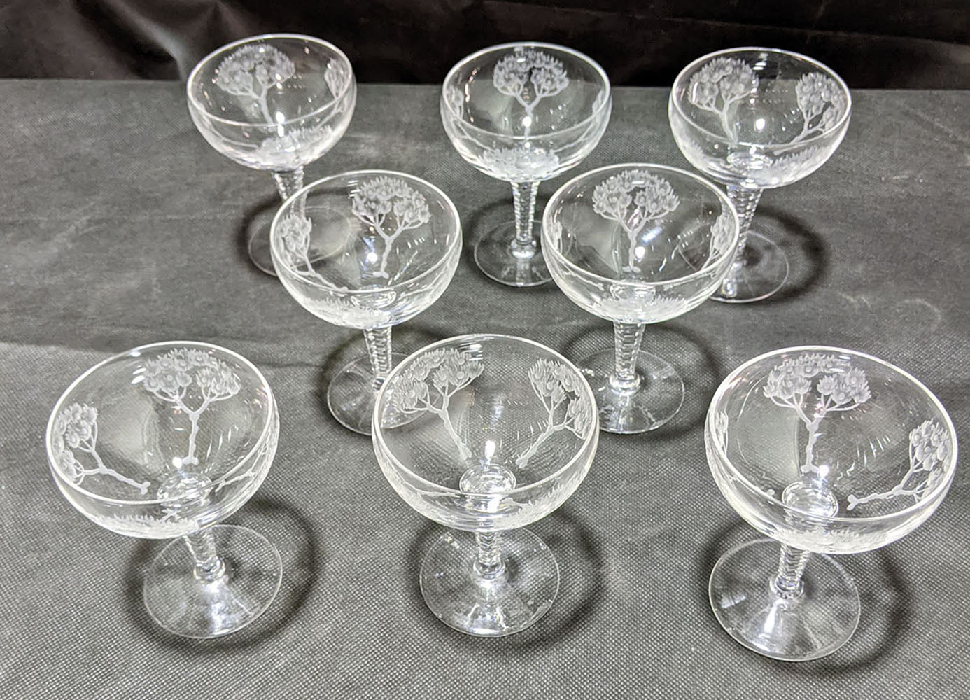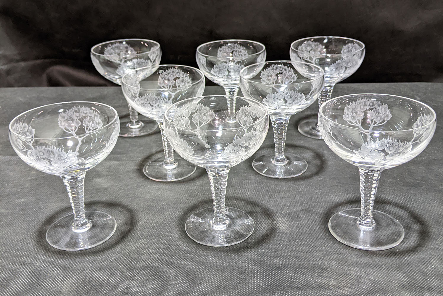 Thank you for looking at our listing for this beautiful set of (8) Stuart etched crystal champagne / tall sherbert glasses.