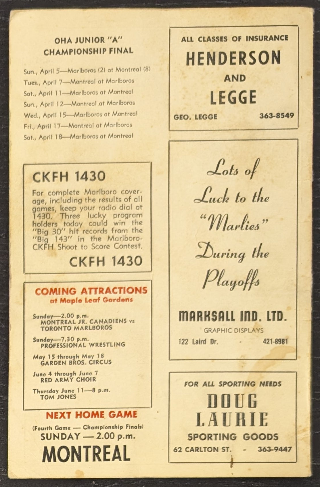 1970 MLG Toronto Marlboros Jr Hab Score Card With Wayne Woon Autograph