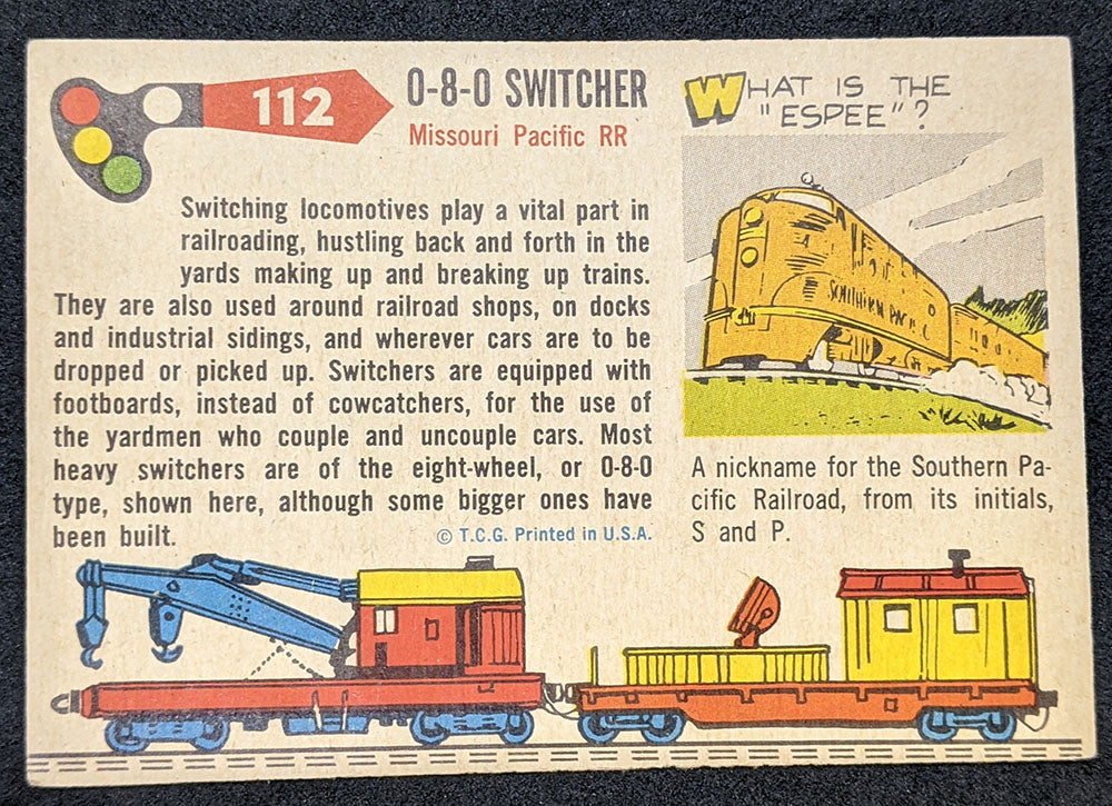 Thank you for viewing our listing for: Topps, 0-8-0 Switcher, Missouri Pacific Railroad, Card#112, Short PrintSeries Rails & SailsRails 0-8-0 SwitcherCard# 112Condition: Very Good