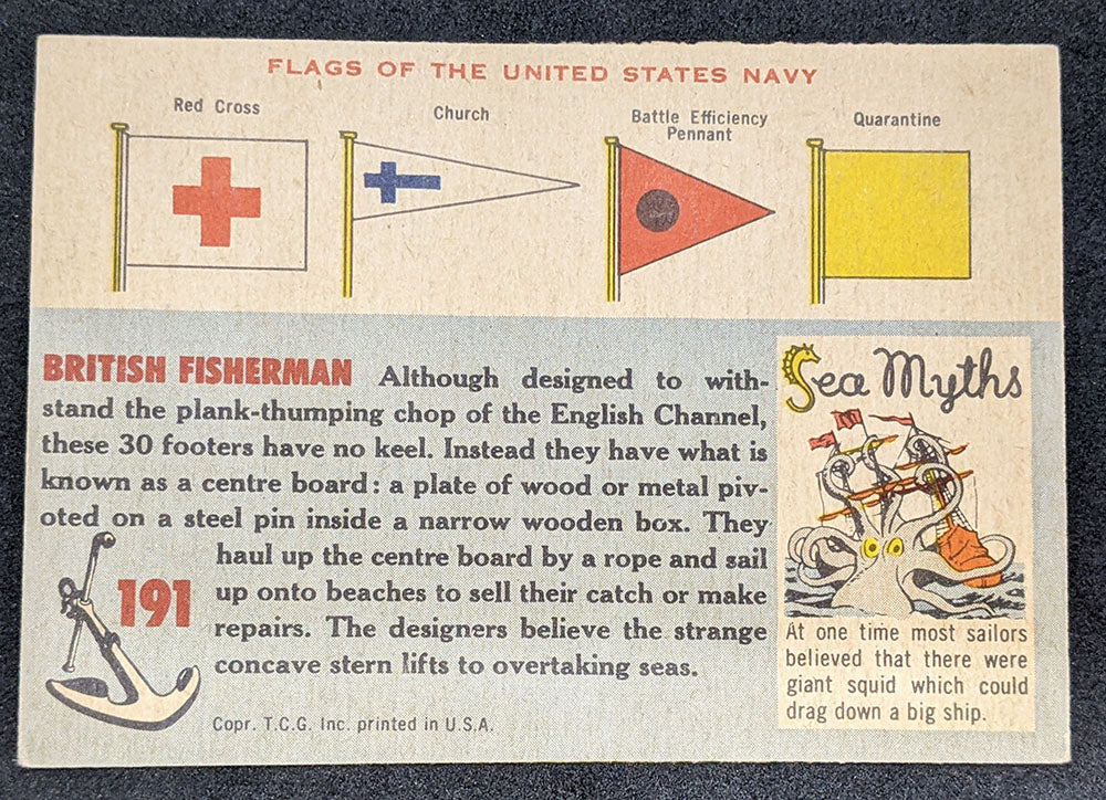 Thank you for viewing our listing for: Topps, 1955 Series Rails & Sails, Hastings Lugger Card#191, S.P. Previously Owned, See pictures Year: 1955 Series Rails & Sails Card # 191 This is a short print Hastings Lugger British Fisherman Condition: Near Mint