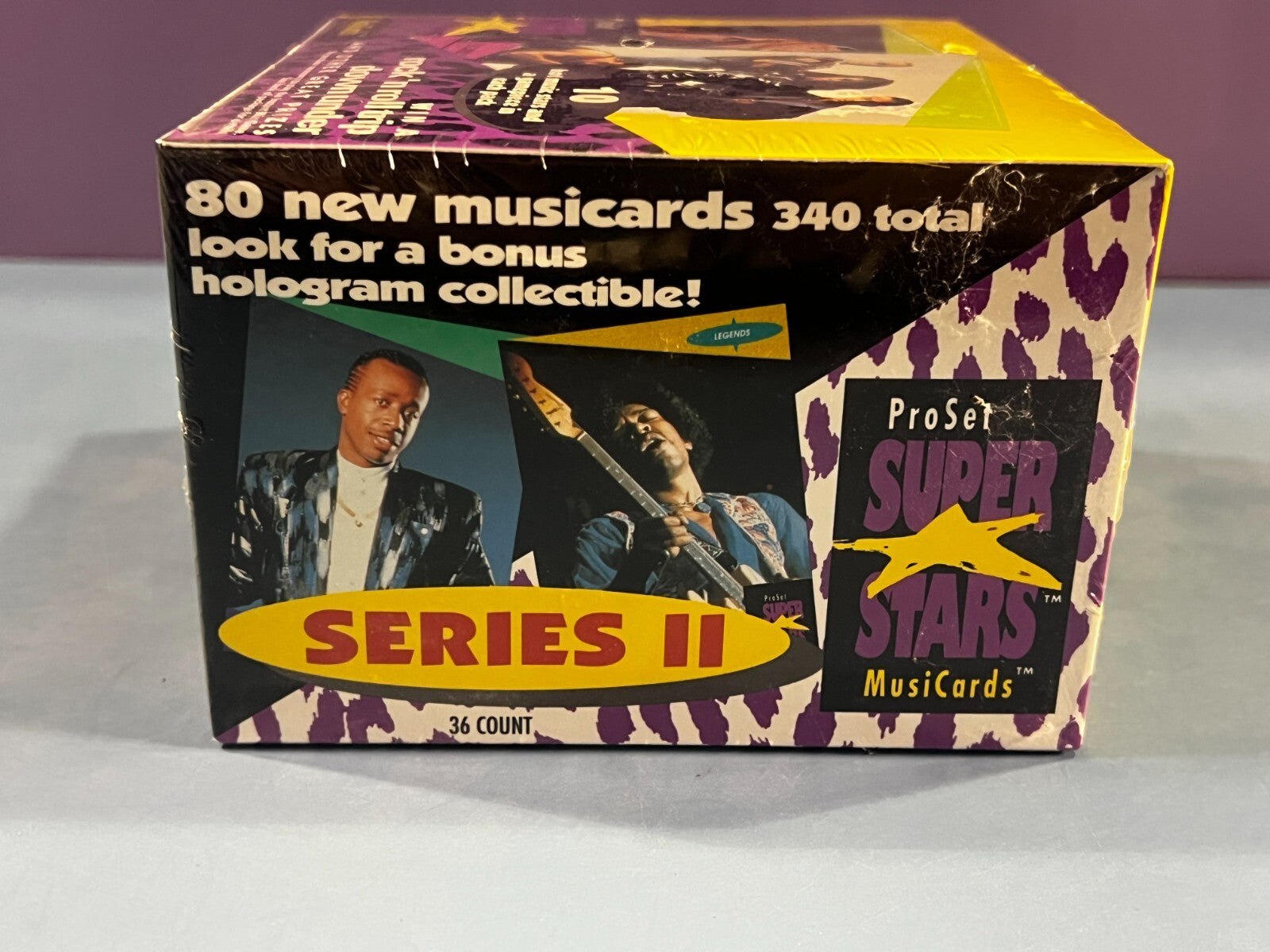 1991 ProSet Super Stars MusiCards Series II factory sealed trading card box. Contains 36 packs, with 10 musicards and 1 gamepiece per pack. Look for a bonus hologram collectible! 80 new musicards, 340 total in series. © 1991 Pro Set, Inc.