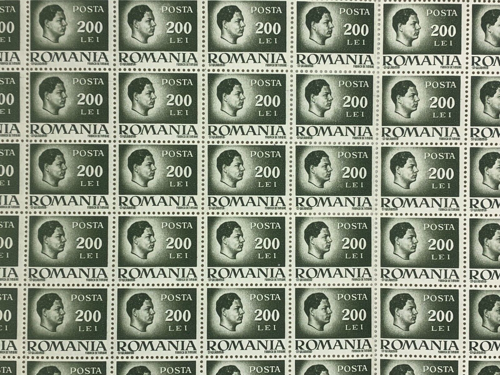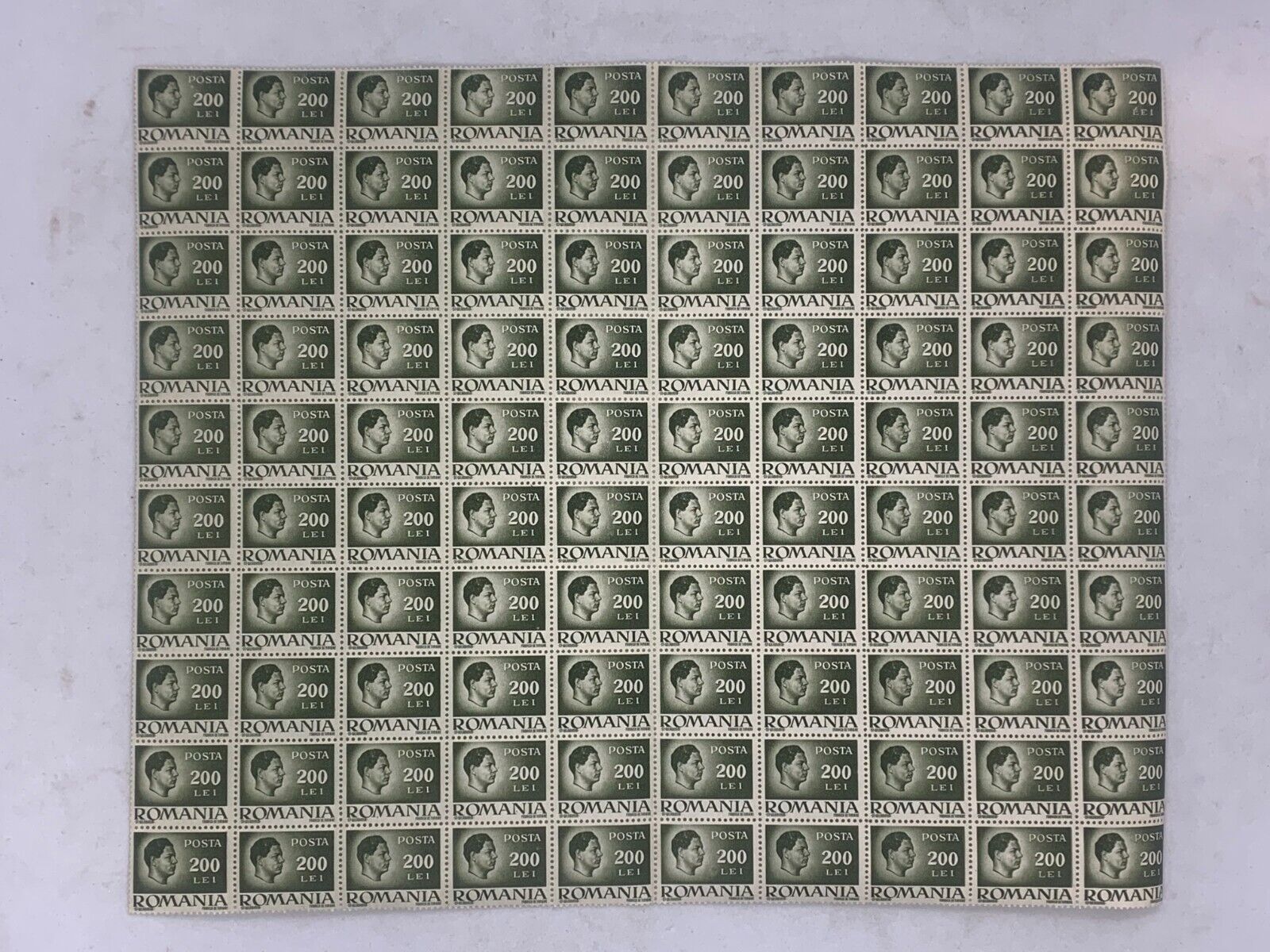10x10 Sheet of 1946 Green Romanian Stamps - Posta Romana (200 Lei)