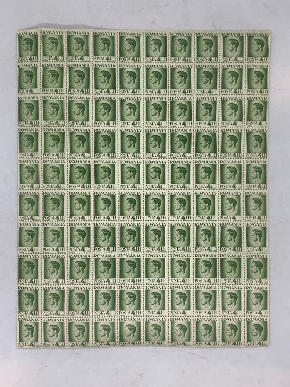 10x10 Sheet of 1946 Green Romanian Stamps - Posta Romana (4 Lei)