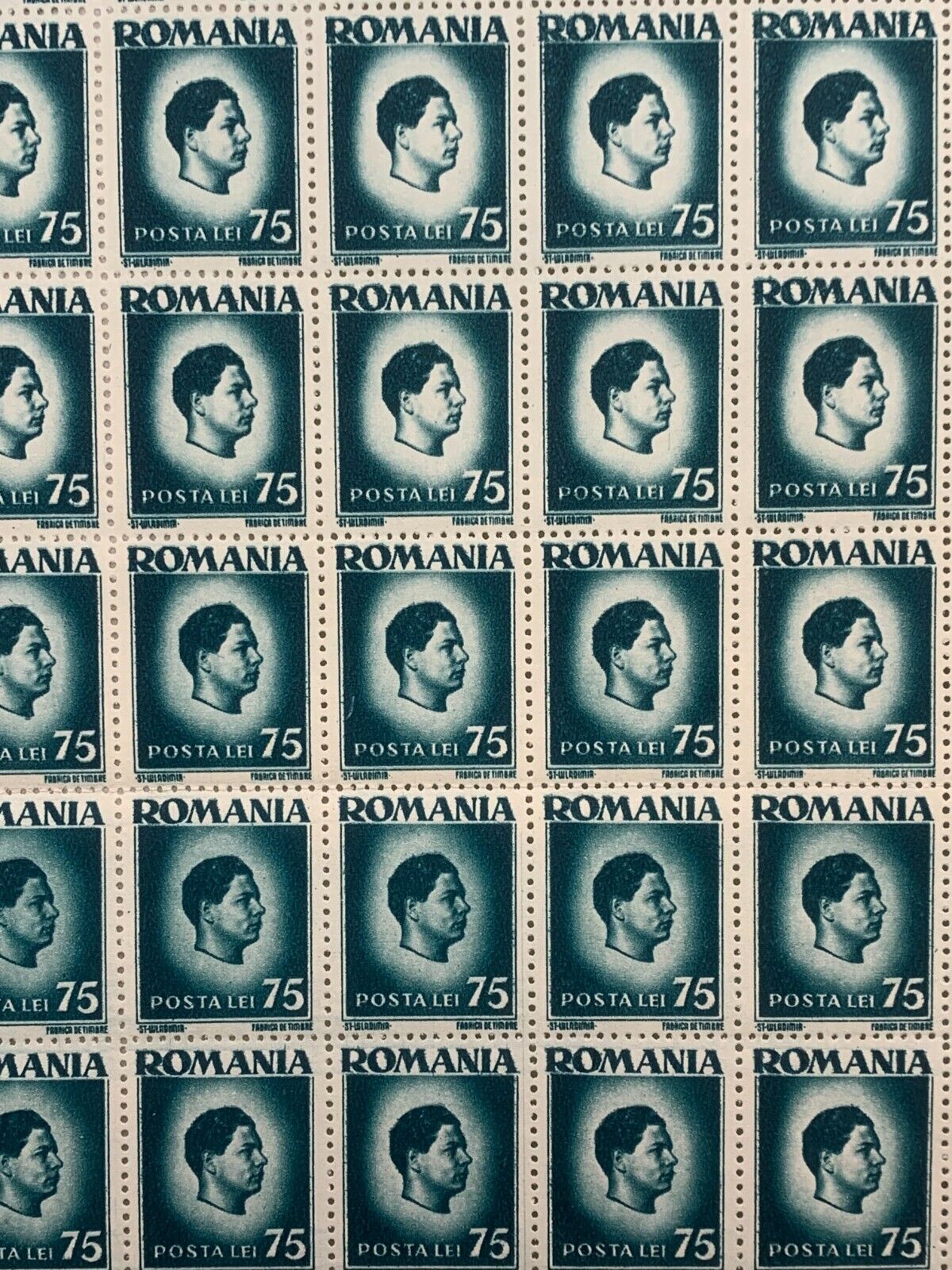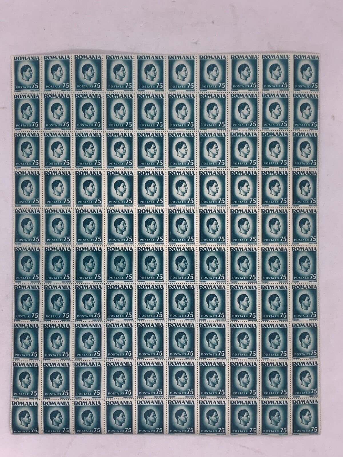 10x10 Sheet of 1946 Green Romanian Stamps - Posta Romana (75 Lei)