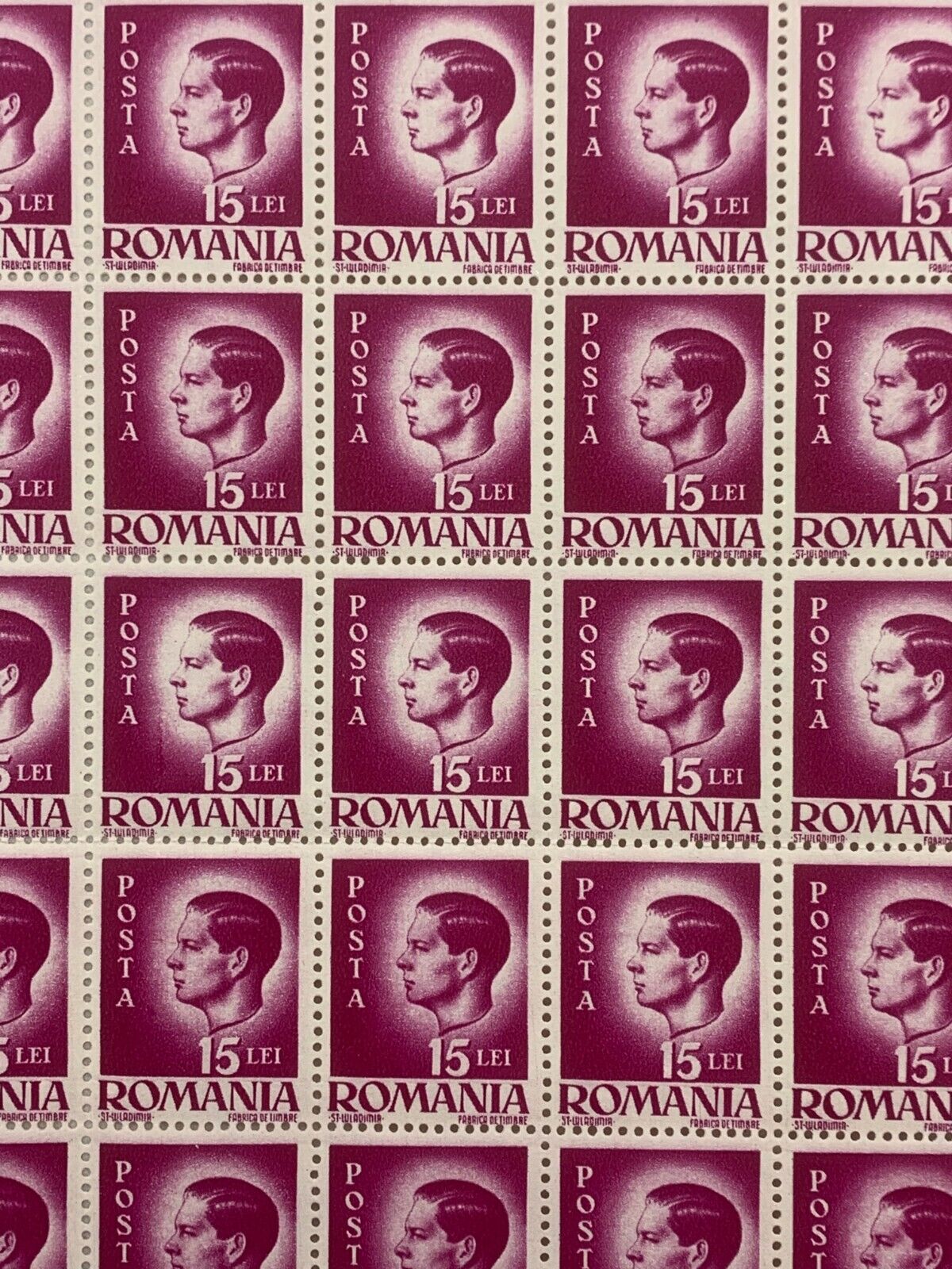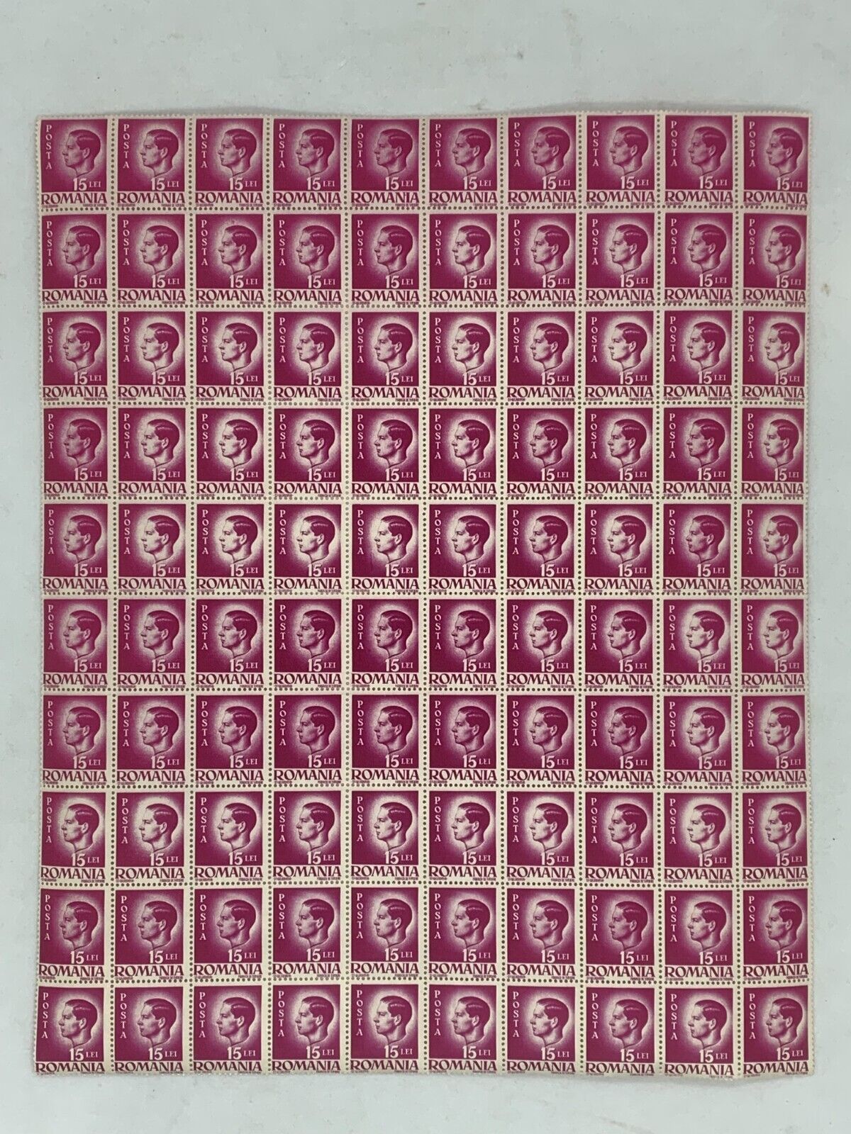 10x10 Sheet of 1946 Magenta Romanian Stamps - Posta Romana (15 Lei)