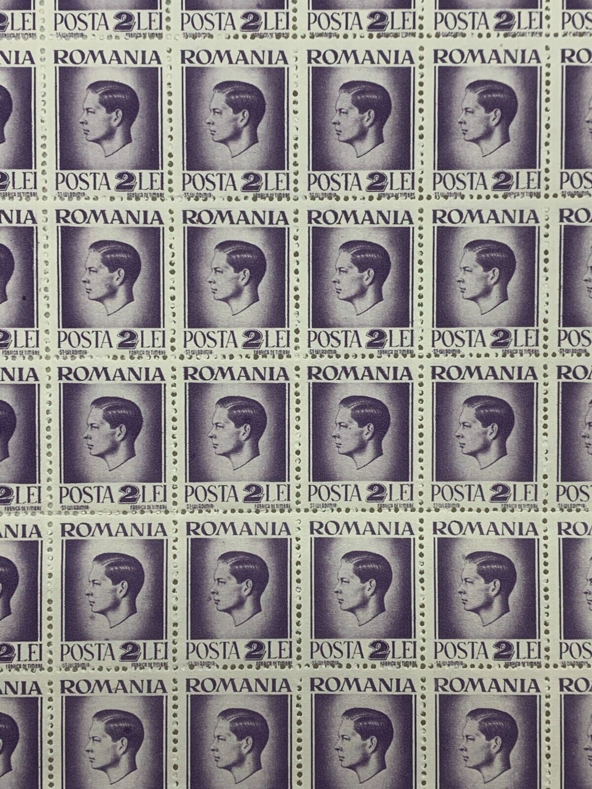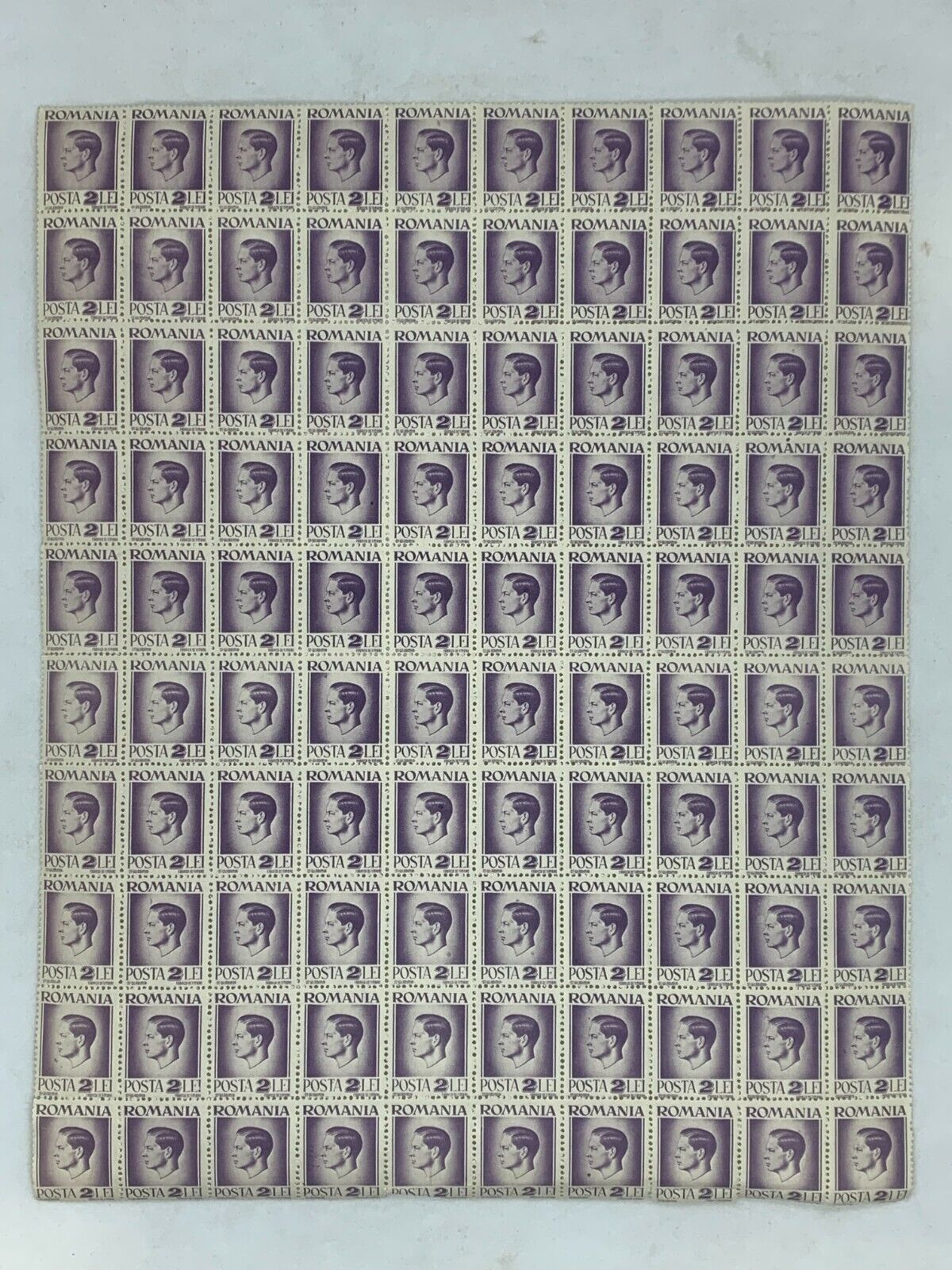 10x10 Sheet of 1946 Violet Romanian Stamps - Posta Romana (2 Lei)