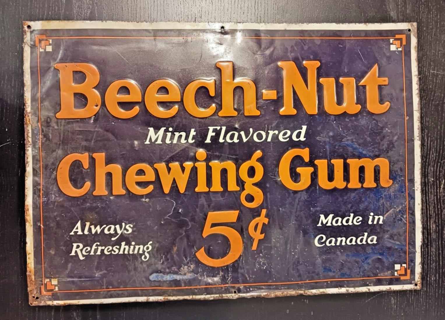 Thank you for viewing our listing: 1930s Beech-Nut Chewing Gum Tin Litho Metal Sign 20" x 14" Canada 5 cent