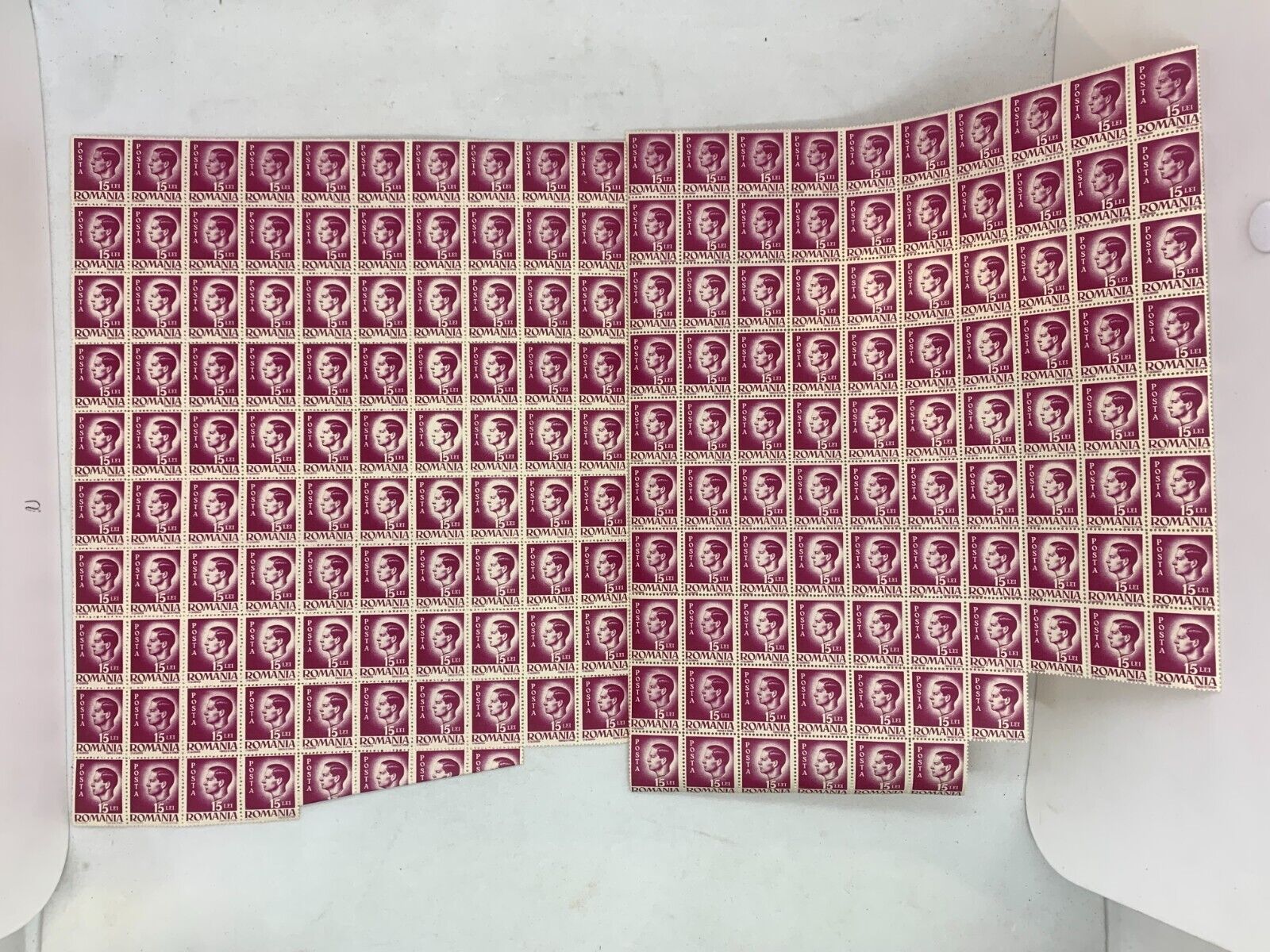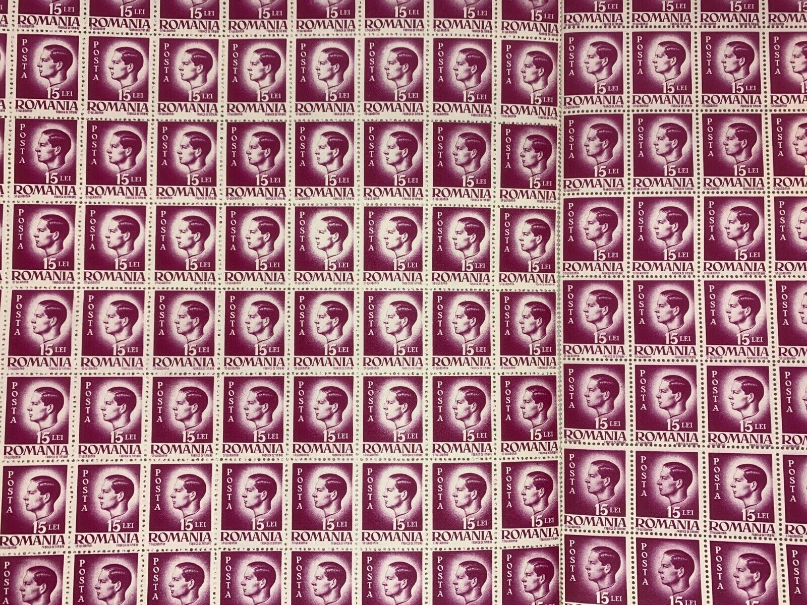 INCOMPLETE 10x10 Sheet of 1946 Violet Romanian Stamps - Posta Romana (15 Lei)