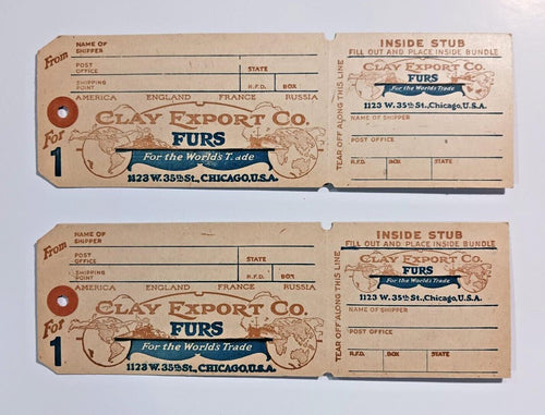 Clay Export Co. Furs Opening Unmailed Dennison Mailing Tag Chicago USA Pair