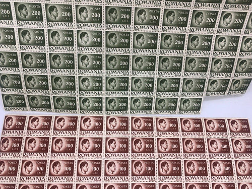 INCOMPLETE 10x10 Sheets of 1946 Green/Brown- Posta Romana Stamps (200 & 100 Lei)