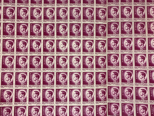 10x10 Sheet of 1946 Magenta Romanian Stamps - Posta Romana (15 Lei)