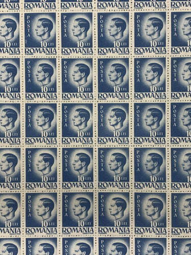 10x10 Sheet of 1946 Ultramarine Romanian Stamps - Posta Romana (10 Lei)