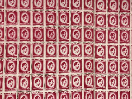 INCOMPLETE 10x10 Sheet of 1946 Pink Romanian Stamps - Posta Romana (40 Lei)