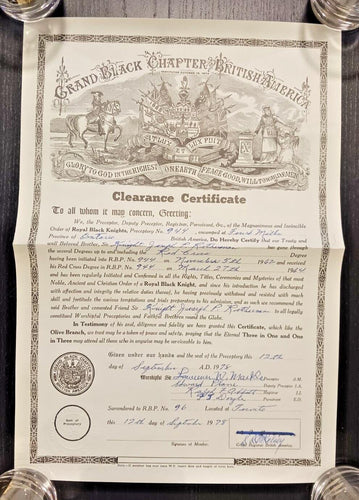 Grand Black Chapter British America Clearance Certificate 1974 No.821