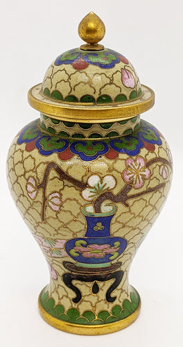 Vintage Chinese Cloisonne Enamel Lidded Trumpet Jar / Vase / Urn