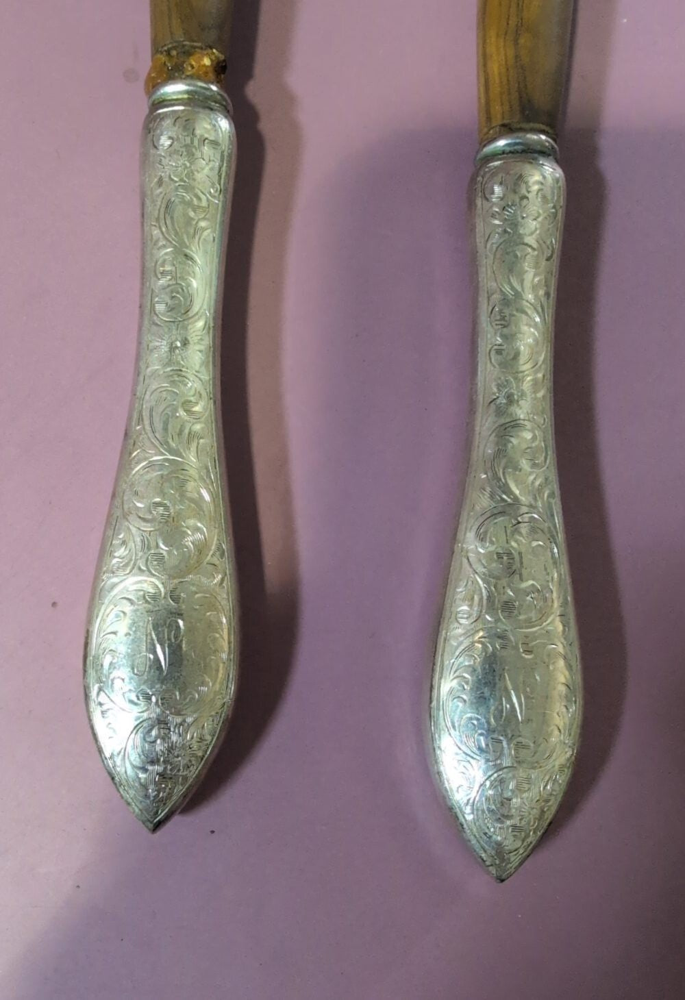 Condition: Previously enjoyed. Good. Wood shows some wear consistent with age. Silver handles exhibit tarnish and signs of use; one handle may have discoloration/repair at the wood joint. Ornate details are visible. Overall good vintage condition. SOLD AS IS (please see pictures)