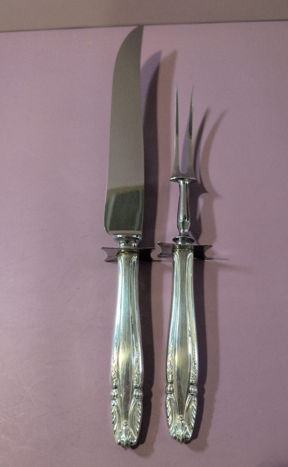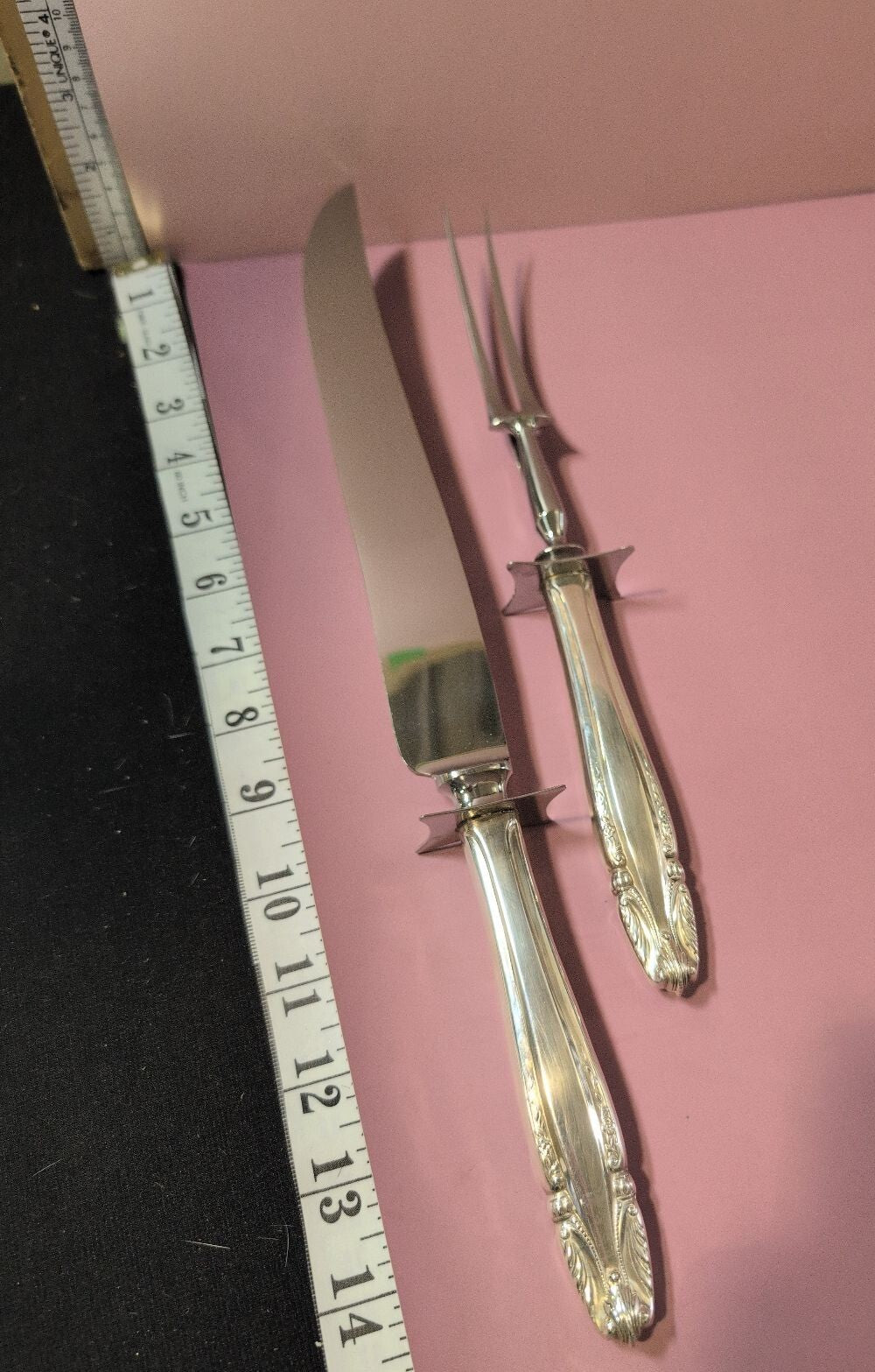Sterling Silver Handle. Vintage carving set including a knife and fork. Both pieces are marked "STAINLESS" and the fork is also marked "MADE IN ENGLAND". The handles feature an ornate, possibly floral, design. Ideal for carving roasts or as a collectible item.