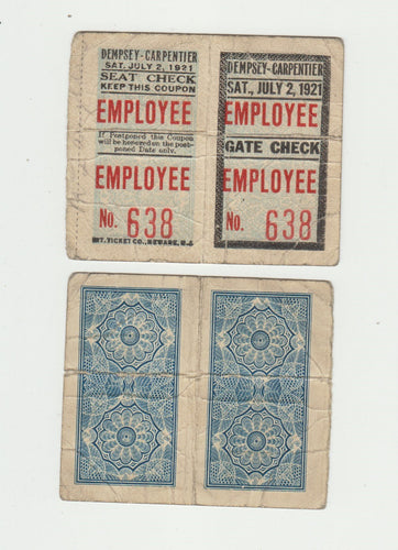 1921 Jack Dempsey-Carpentier Employee Coupon / Ticket - Fight of the Century