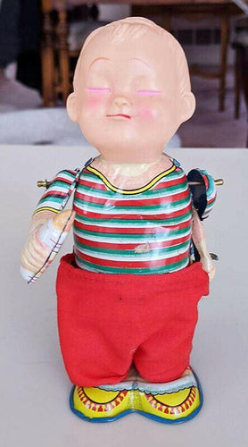Vintage Metal Wind-Up Toy - baby Drinking & Pulling Down Pants - Works!